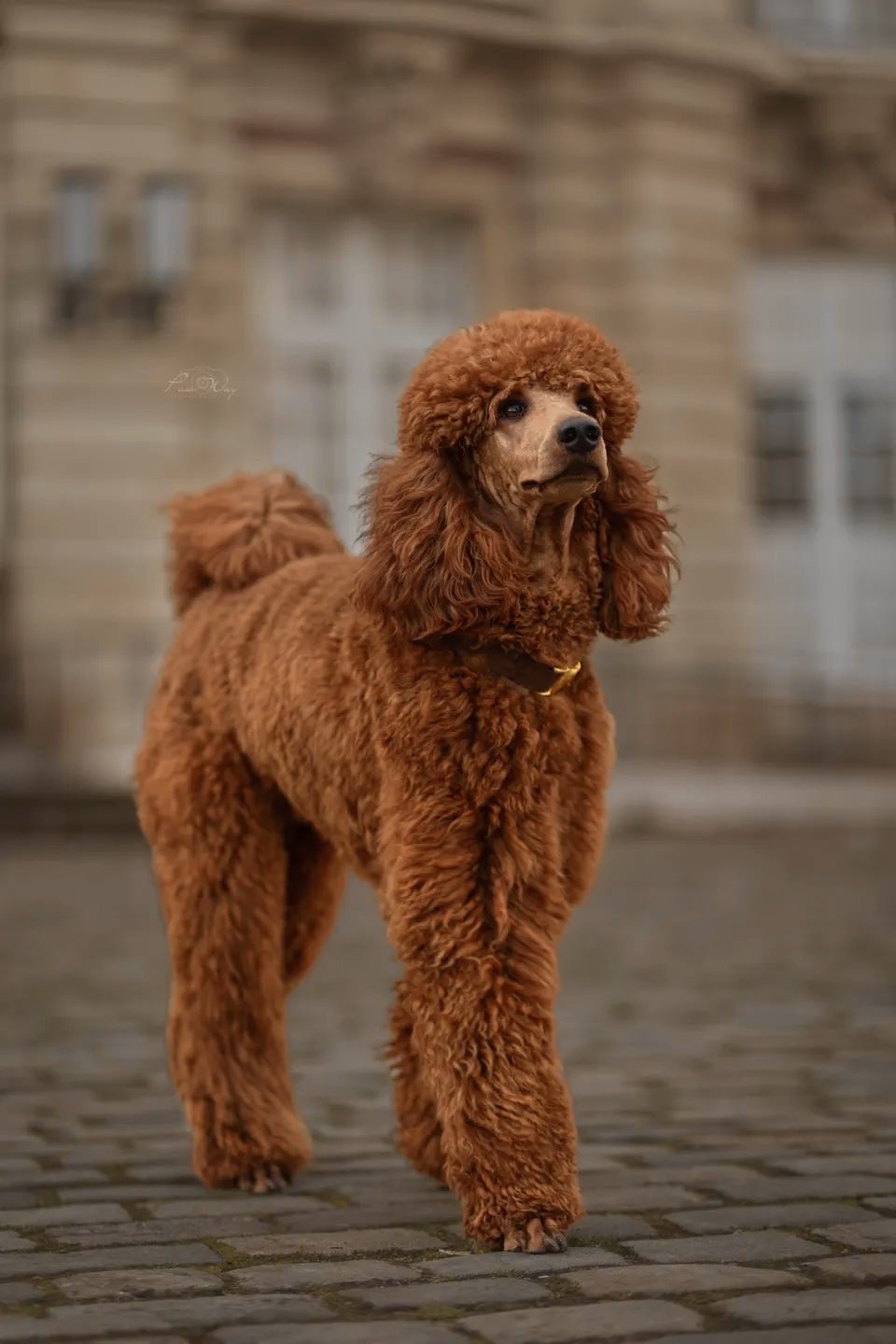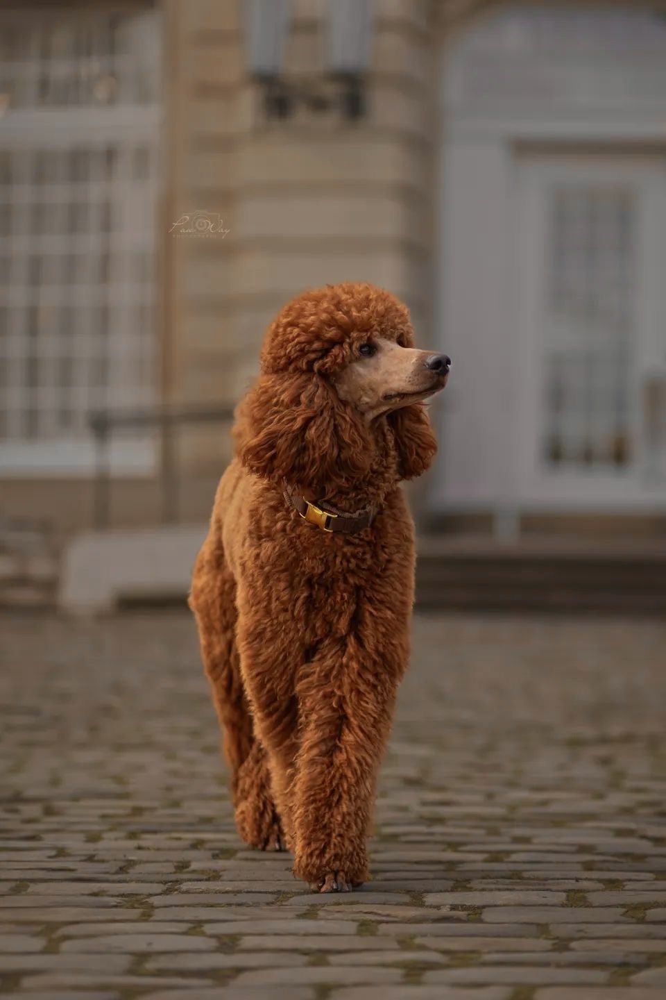 Mit ihren 30 kg und einer Schulterhöhe von 58 cm ist sie harmonisch gebaut und wirkt in ihrer Erscheinung elegant und kraftvoll zugleich. Ihr tief dunkelrot‑mahagonifarbenes Fell ist ein besonderer Blickfang und entfaltet im Sonnenlicht eine beeindruckende Leuchtkraft.